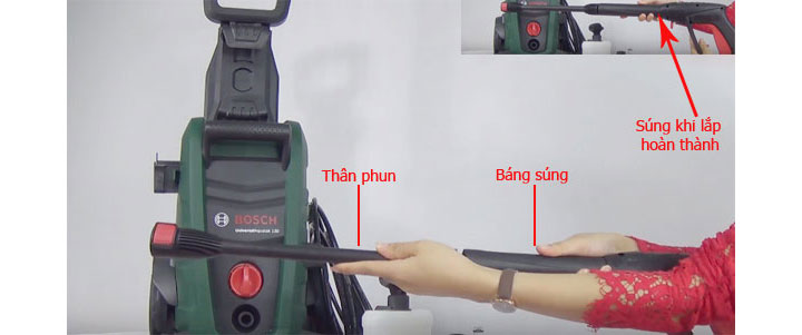 Bước 1: Lắp báng súng vào thân phun. Bosch Universal Aquatak 130 chỉ đi kèm một thân phun, một đầu phun nên việc lắp đặt sẽ dễ dàng hơn. Bạn tiến hành lắp đúng khớp nối, khi nghe tiếng tách là được.