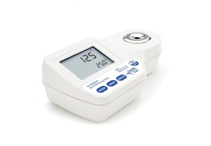 HI96814 là khúc xạ kế cầm tay Hanna được thiết kế chuyên nghiệp để đo độ ngọt của các mẫu rượu, nước trái cây dưới dạng % Brix. Phần lớn đường có trong nước ép nho là fructose và glucose. Độ ngọt của nho vụ mùa thường có độ ngọt 29-35% Brix.