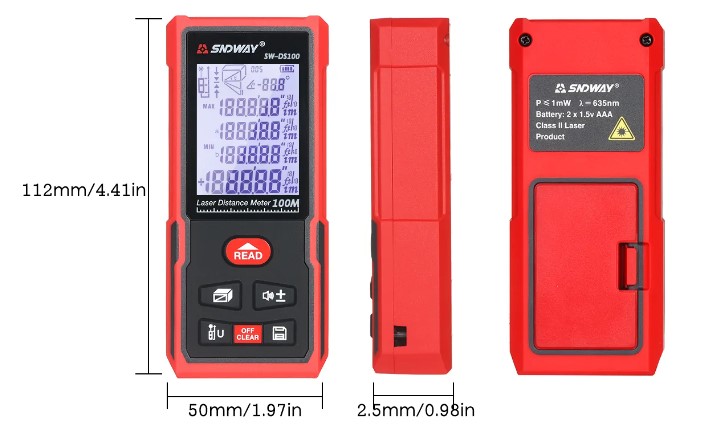 Máy đo khoảng cách laser đa năng SNDWAY SW-DS100 có kích thước nhỏ gọn, cầm tay, linh hoạt khi đo đạc và có màu 2 màu đen và đỏ là màu chủ đạo. Ngoài ra, thiết kế vỏ ngoài máy đo khoảng cách đạt tiêu chuẩn IP54 cho phép chống bụi và nước hiệu quả ngay cả trong môi trường khắc nghiệt nhất.