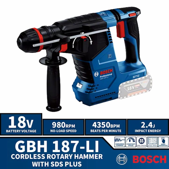 Máy làm việc với 3 chức năng khoan búa, khoan thường và đục phá bê tông. Bosch GBH 187-LI làm việc với lực đập lên tới 2.4J, tốc độ không tải 930 vòng/phút, tốc độ đập lên tới 4.350 bpm.