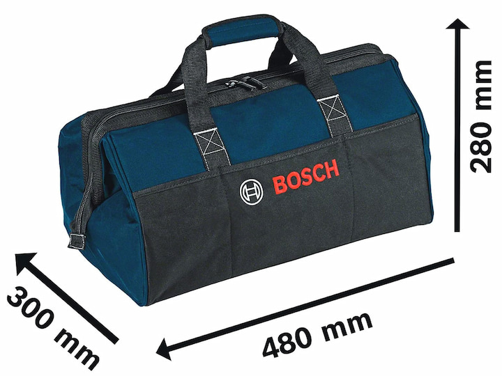 Túi xách công cụ Bosch 1619BZ0100 có kích thước 48x30x28cm với miệng túi rộng, đáy có thanh chắn cứng để giữ form đồng thời sắp xếp đồ vật dễ dàng hơn. Túi đủ sức chứa nhiều loại công cụ khác nhau như máy khoan, máy mài, máy cưa, cờ lê, tua vít,...